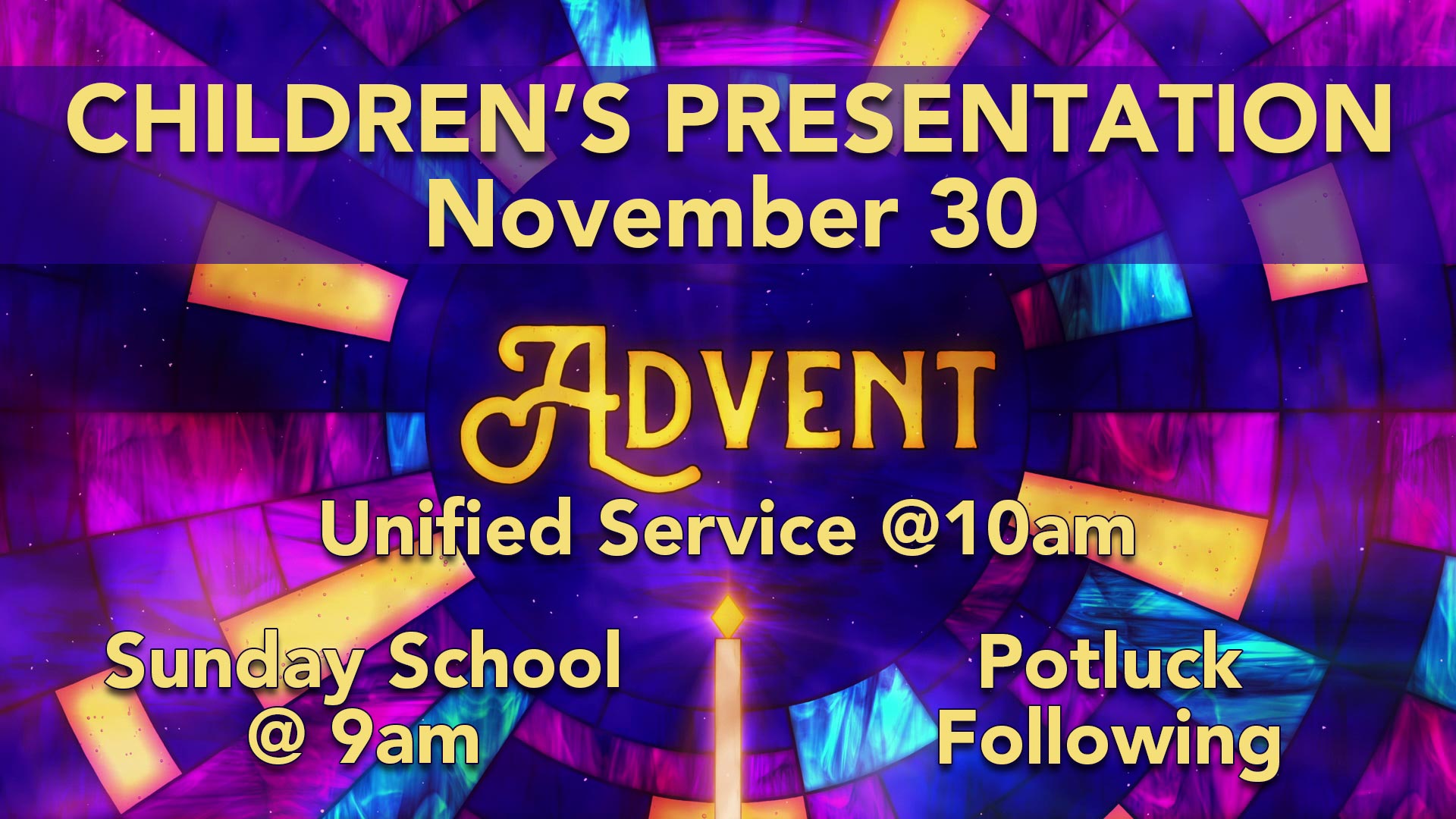 Unified Worship Service kicking off the Advent season with Children's presentation, Sunday School at 9am and Potluck Lunch following.